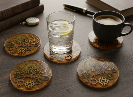 Steampunk Resin Coasters Set of 2 – Gear & Metal Trinket Drink Coasters – Mica Pigment Art – Gothic Industrial Home Decor