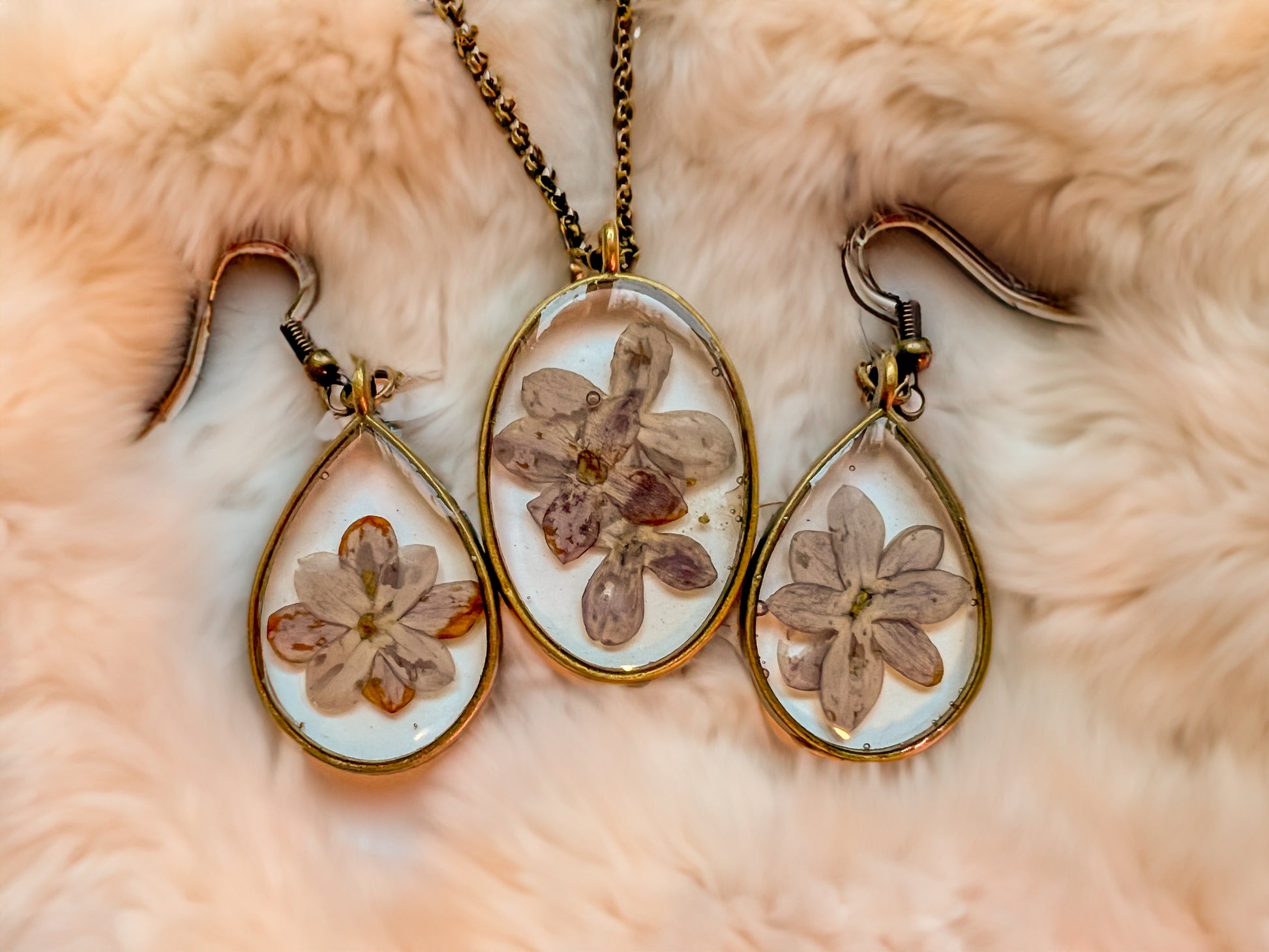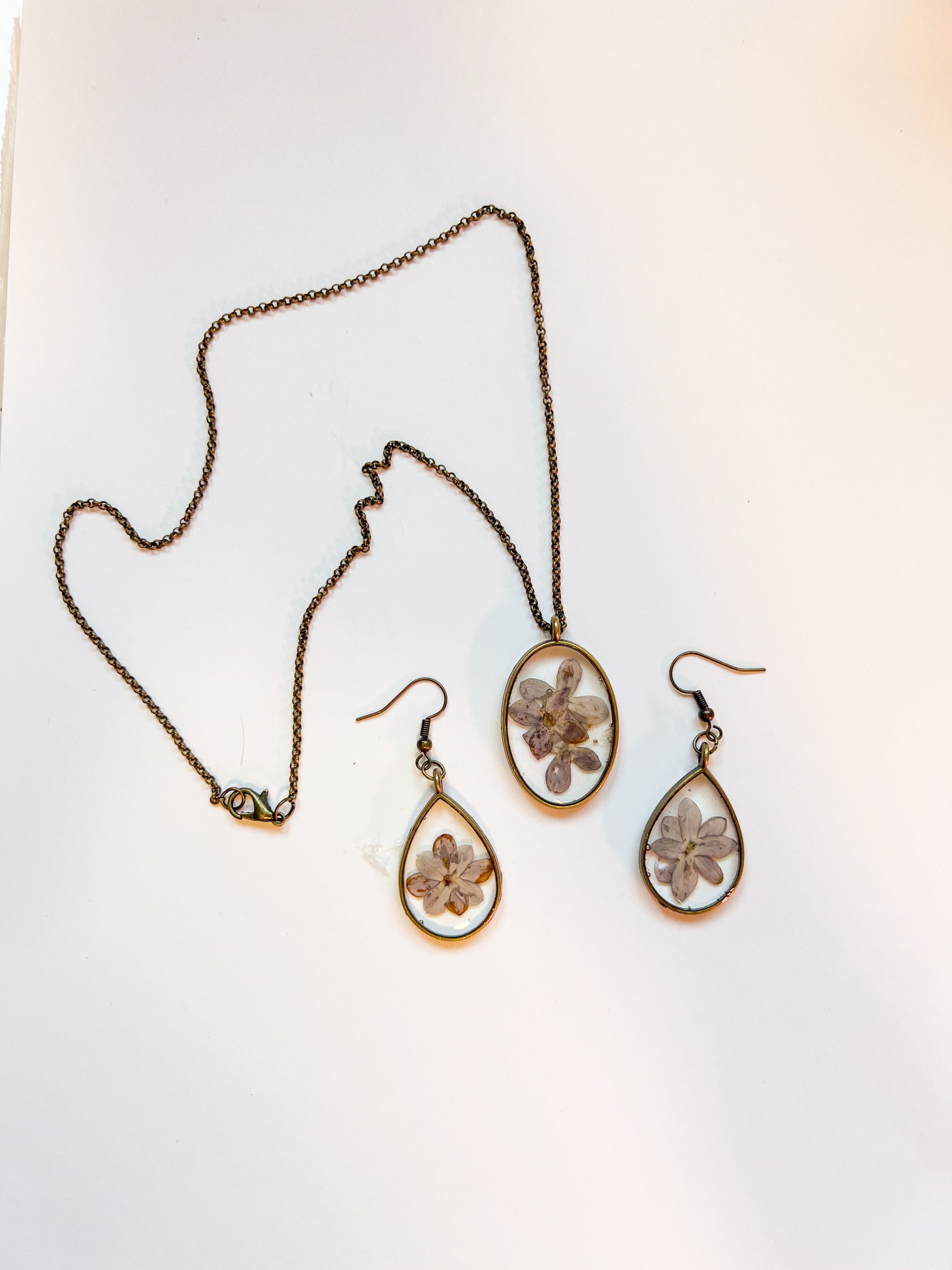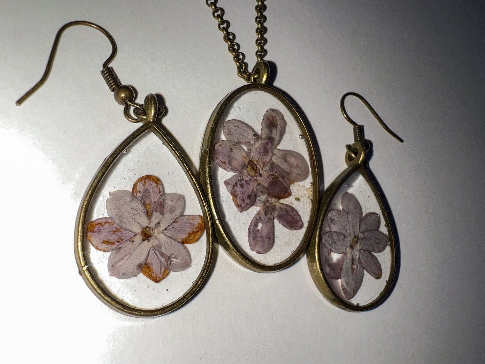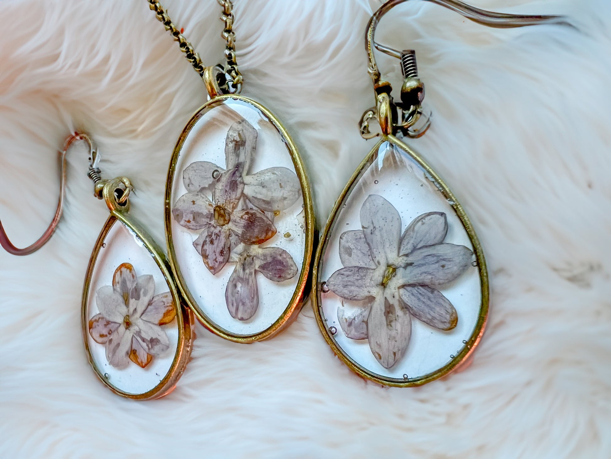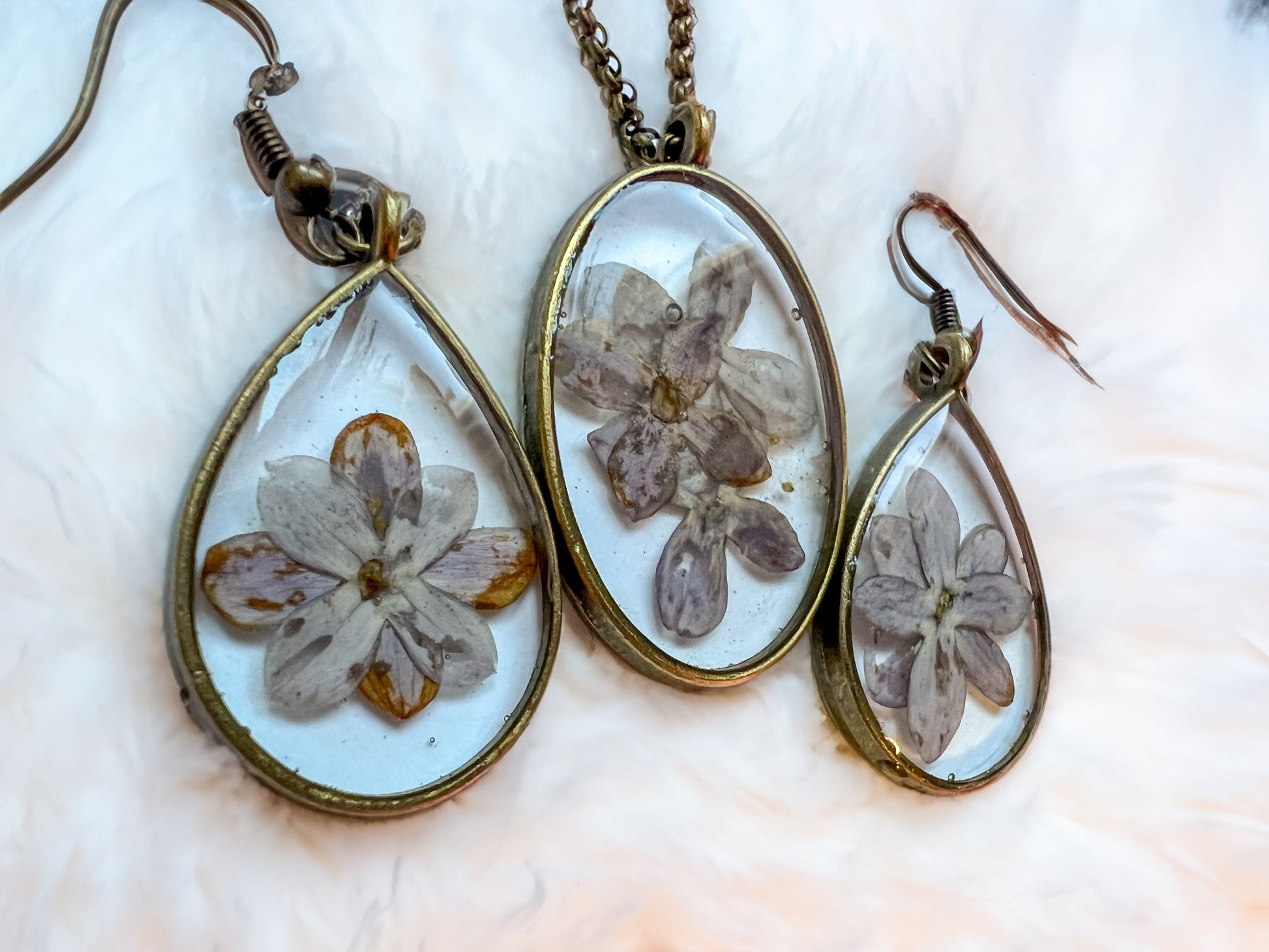 Lilac Pendant and Earring Set in Bronze | Handmade Jewelry | Resin Craft