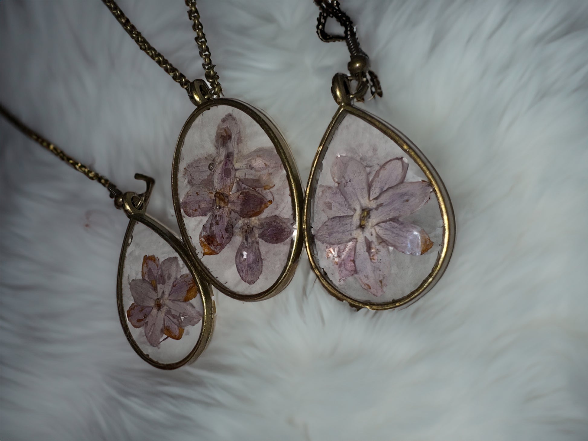 This Pendant (chain included) and Earring set is made with lilac flowers and resin. The chain, bezels and earing hooks are aged bronze. These are very light weight and can be a statement piece with any outfit. They are one of a kind
