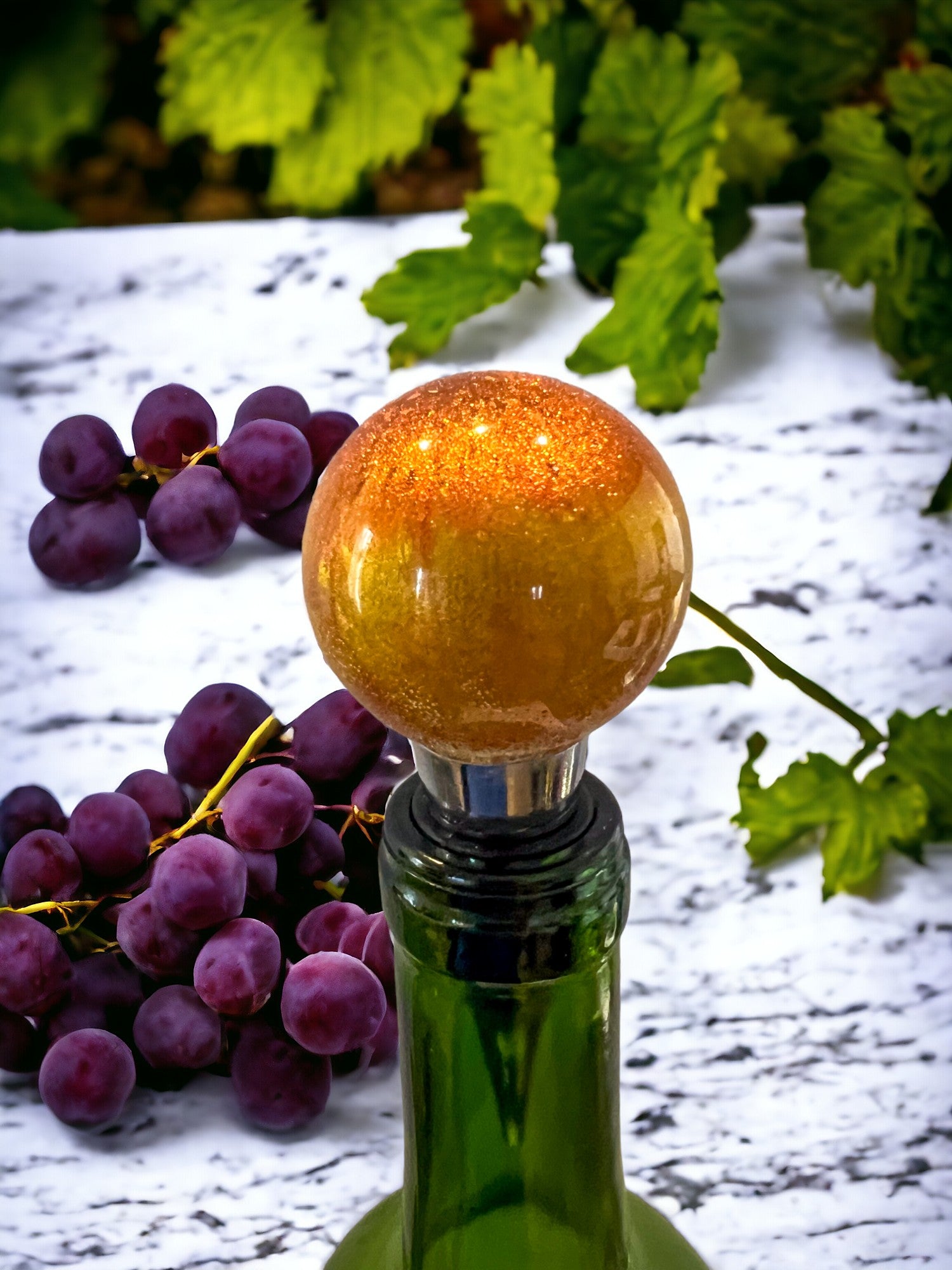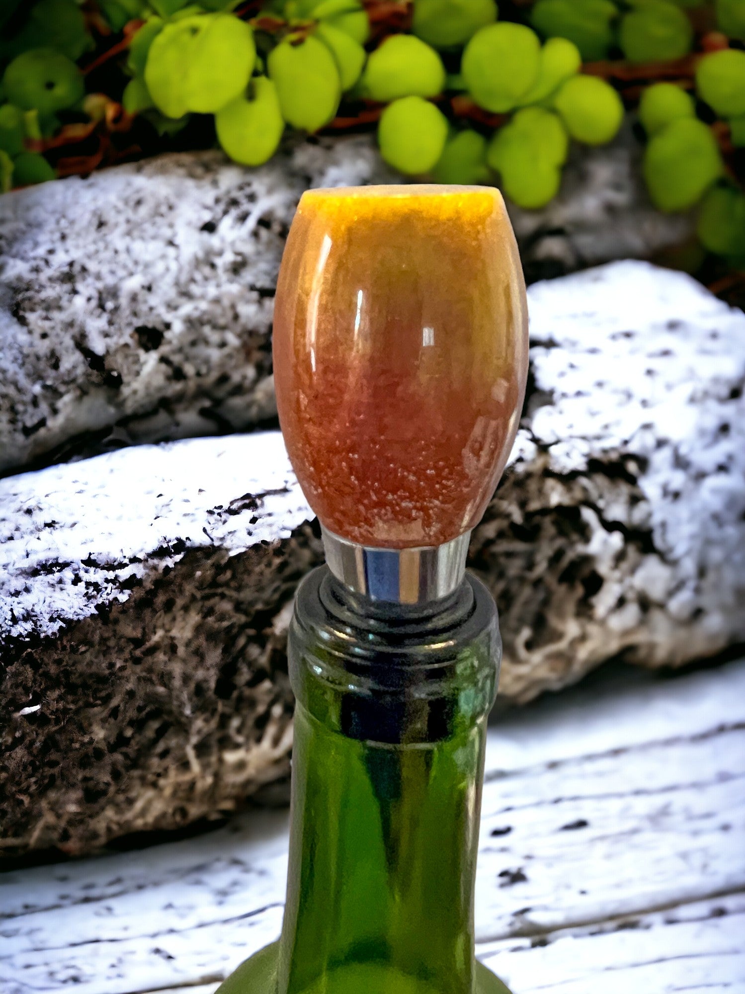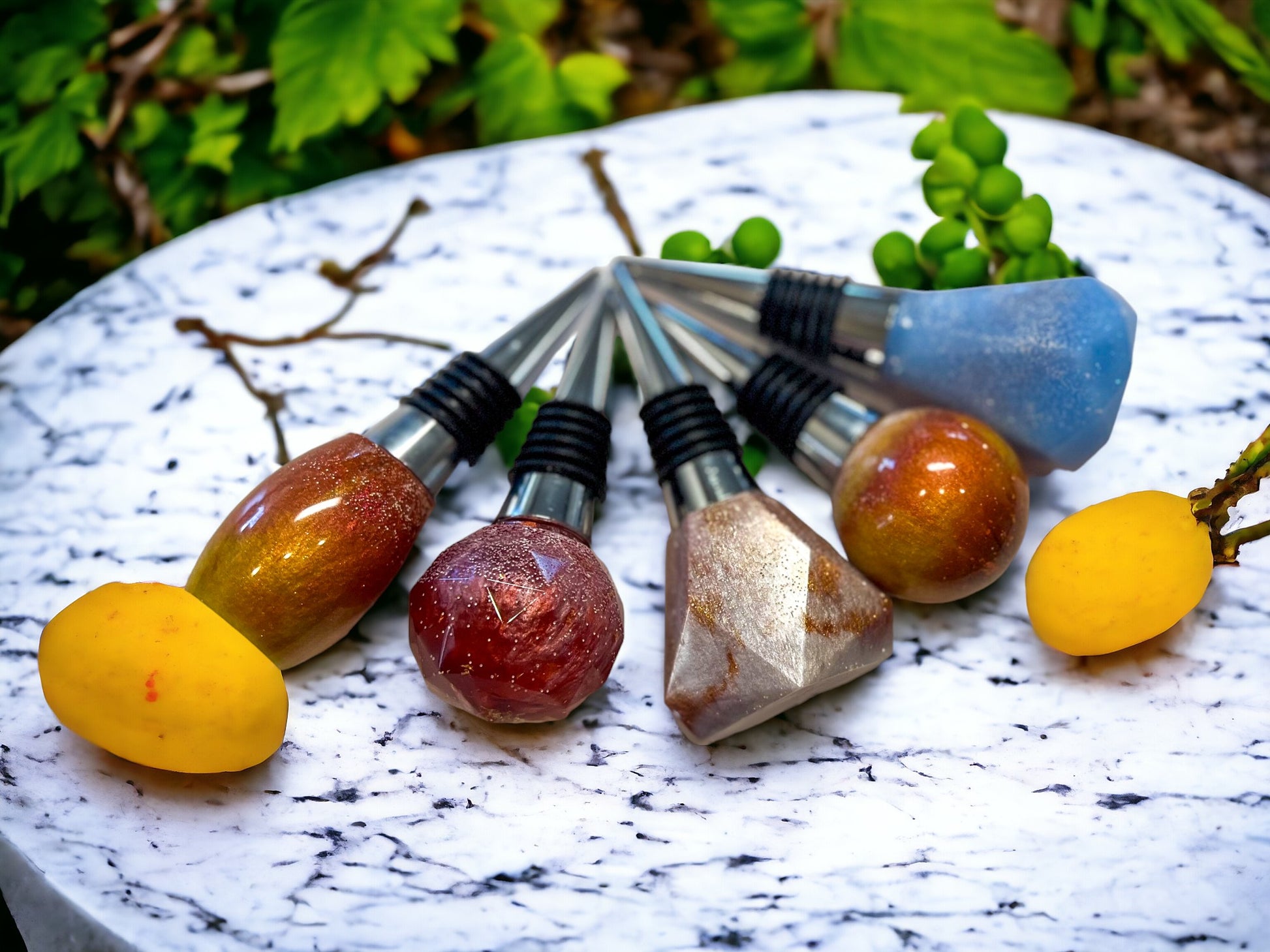 Resin wine stoppers made with various colors to create a slight marbled effect. These range in size from 5cm tall to 3.5cm tall with a standard mettal stopper attached that is 6.2 cm tall.