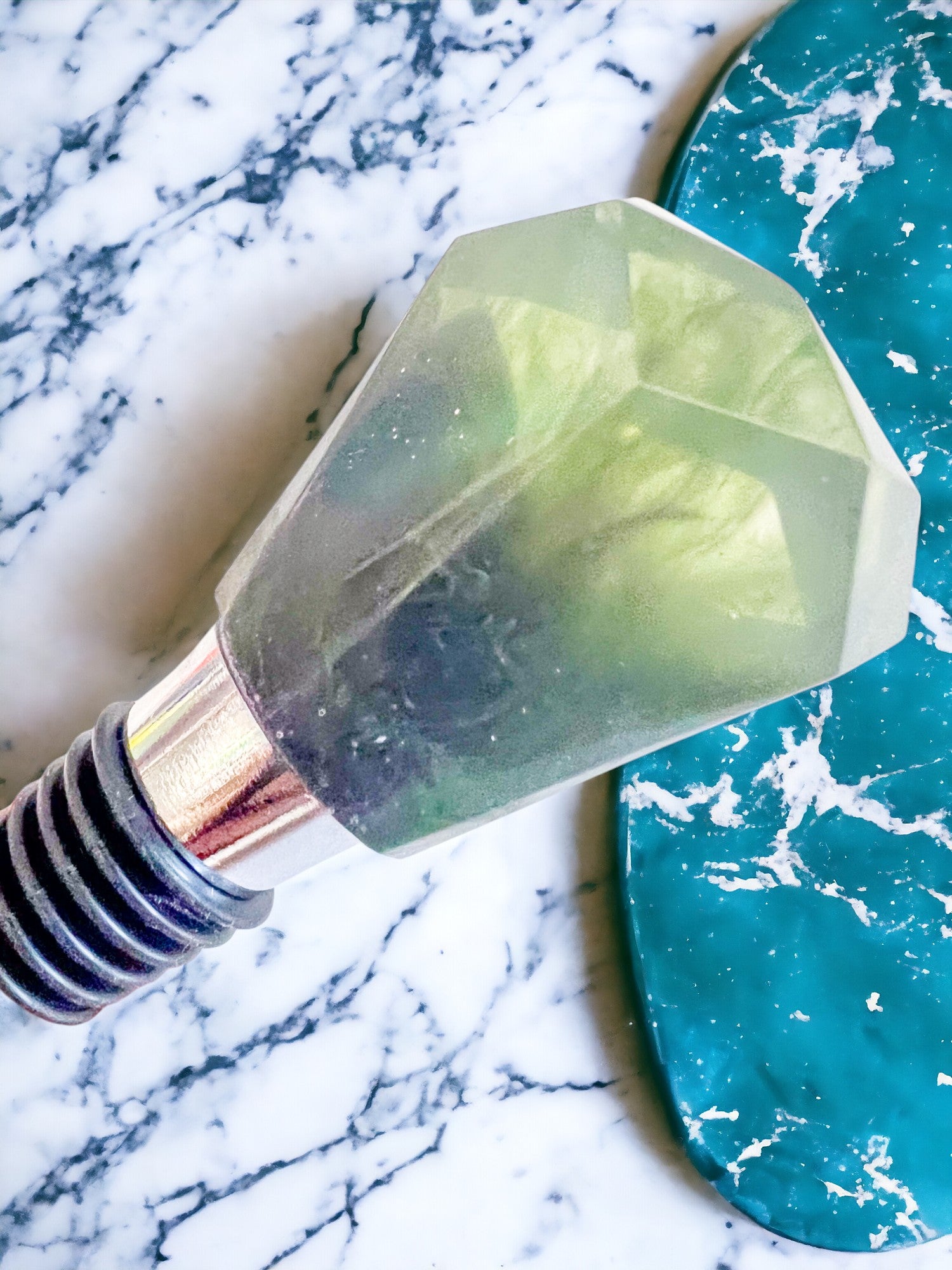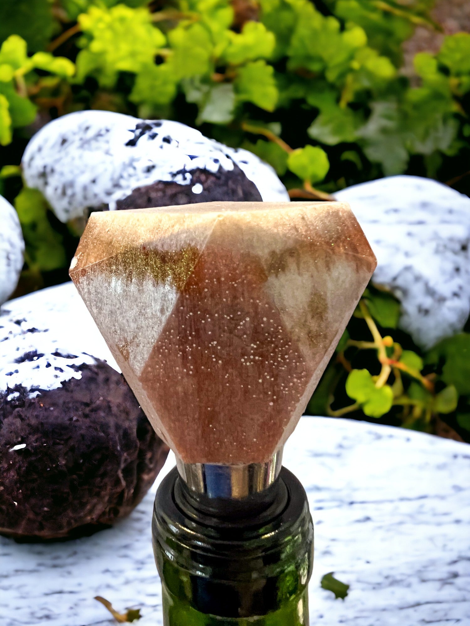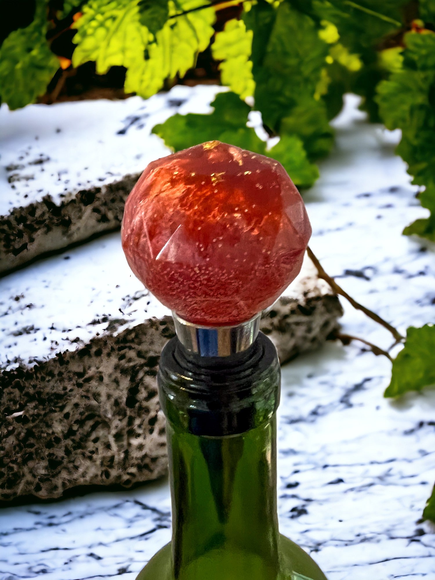 Resin wine stoppers made with various colors to create a slight marbled effect. These range in size from 5cm tall to 3.5cm tall with a standard mettal stopper attached that is 6.2 cm tall.